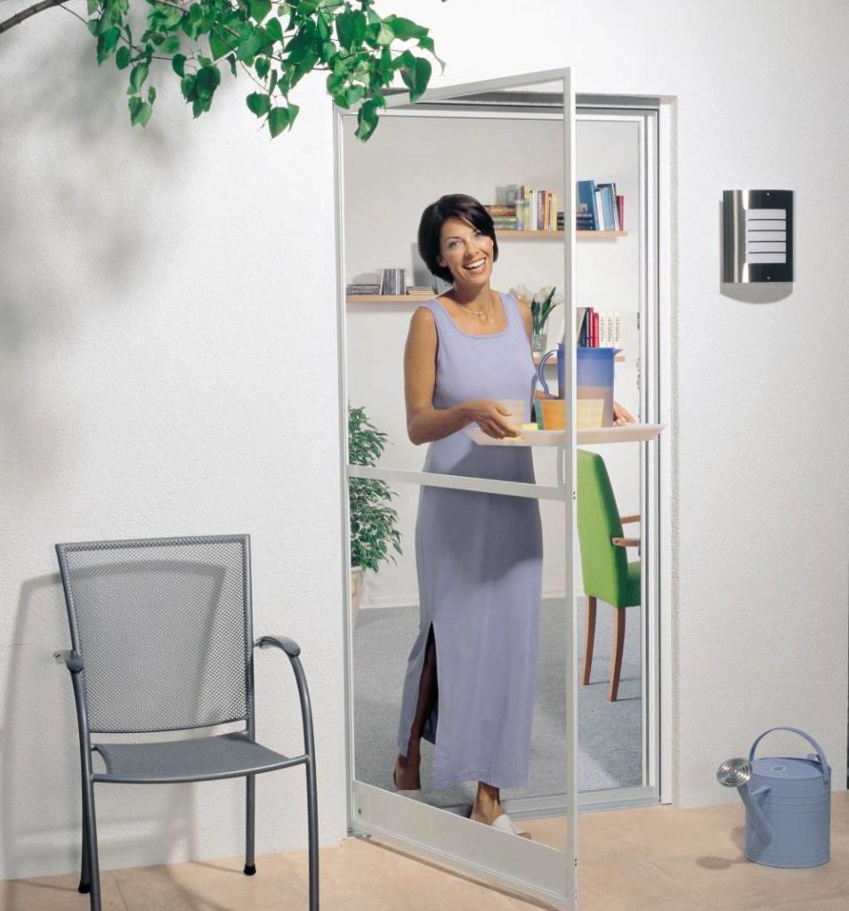 Свежий воздух спокойно попадает сквозь мелкую сетку. В отличие от спреев от комаров изделие не выделяет вредных веществ. Открывается она как обычная дверь. Ее легко установить. Металлический каркас можно окрасить практически в любой цвет. Дверь устанавливается на завесы. Недостаток конструкции в том, что надо всегда иметь свободную руку, чтобы открывать и закрывать. Также ее трудно установить самостоятельно.