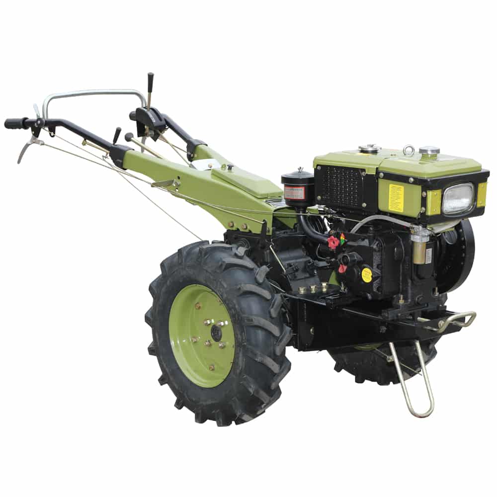 Защиту от перегрева двигателя обеспечивает система водяного охлаждения. Запуск ручной от инерционного стартера. МКПП выдает 6 скоростей вперед и 2 реверса. Есть возможность переключается на “повышенную” и “пониженную” передачи, для этого достаточно установить рычаг в соответствующее положение. ВОМ позволяет присоединять к мотоблоку любое навесное оборудование. Имеется фара, позволяющая выполнять работы в темное время суток. Пневматические колеса имеют мощный протектор, не дающий агрегату пробуксовывать во время эксплуатации.