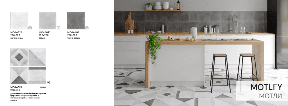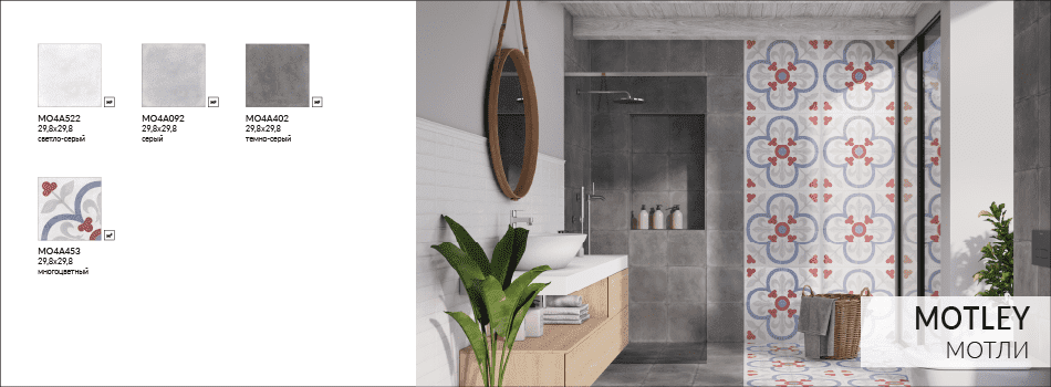 Монохромная плитка MOTLEY открывает большие возможности по созданию уникальных интерьерных решений. Семь геометрических и растительных рисунков могут выкладываться как самостоятельно в виде современного пэчворка, так и в сочетании с другими элементами коллекции. Комбинация однотонной и цветной узорной плитки позволит элегантно зонировать пространство.