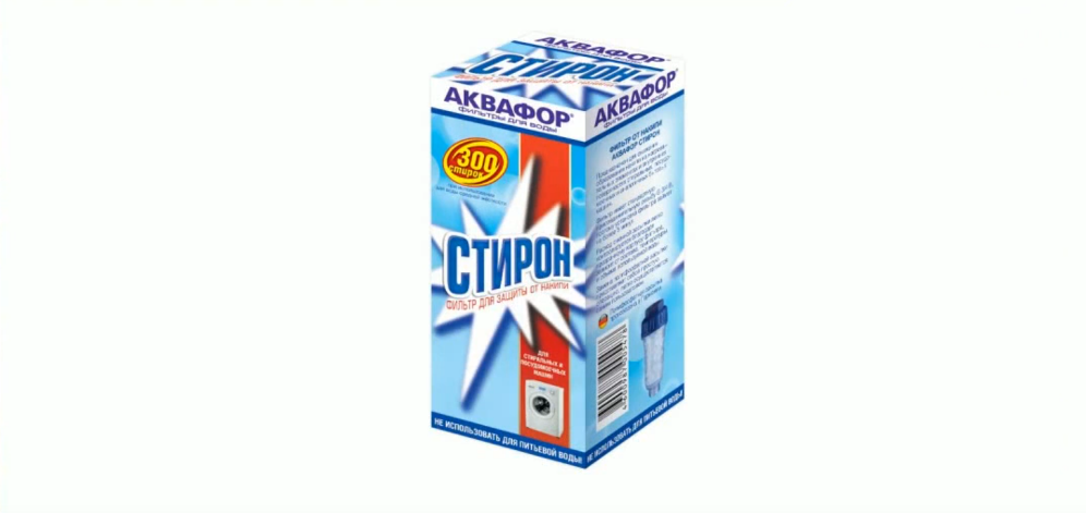 2.Аквафон Стирон – полифосфатный фильтр от российского бренда «Аквафор». Хорошо зарекомендовал себя в защите от накипи стиральных и посудомоечных машин. Полностью заменяет собой любые порошковые средства от накипи. Монтируется между трубой подачи воды и самой техникой. Размеры для подключения стандартны, поэтому для монтажа не требуются переходные кольца. Наполнения хватает на 300 стирок.