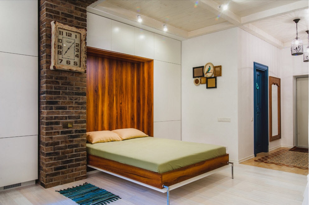 Спальня с кроватью, спрятанной в дневное время, будет всегда просторной, а дополнительные функциональные приспособления позволят с умом хранить все необходимое.