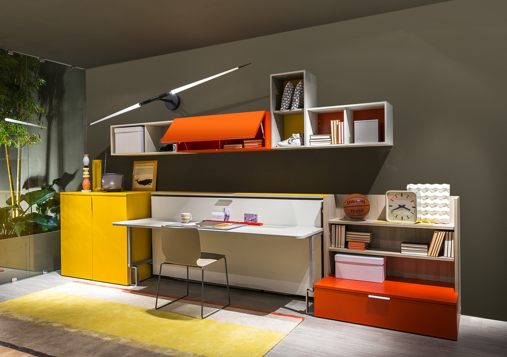 Откидная стол-кровать совмещает в себе место для сна, учебных занятий и систему хранения. Кровать и стол подвергаются преобразованию, а шкаф служит в качестве стационарной основы.