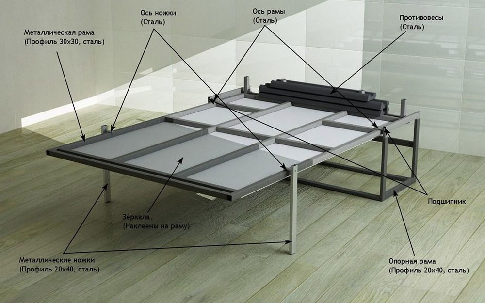 - Металл. Из этого материала может изготавливаться не только каркас, но и крепежные элементы, ножки, подъемный механизм. Преимуществом тяжелых сплавов является отсутствие риска их деформации. Они способны выдерживать большую массу.
