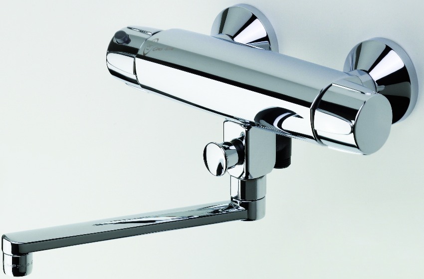 Термосмеситель для умывальника способен полностью справиться с поставленной задачей относительно поддержания температуры воды в заданном режиме. Вертикальная модель с носиком для слива воды может быть установлена на раковину или стену. В конструкцию термостатического смесителя для ванны и душа входят излив и лейка. Такое устройство выполняется преимущественно из латуни с хромовым покрытием.