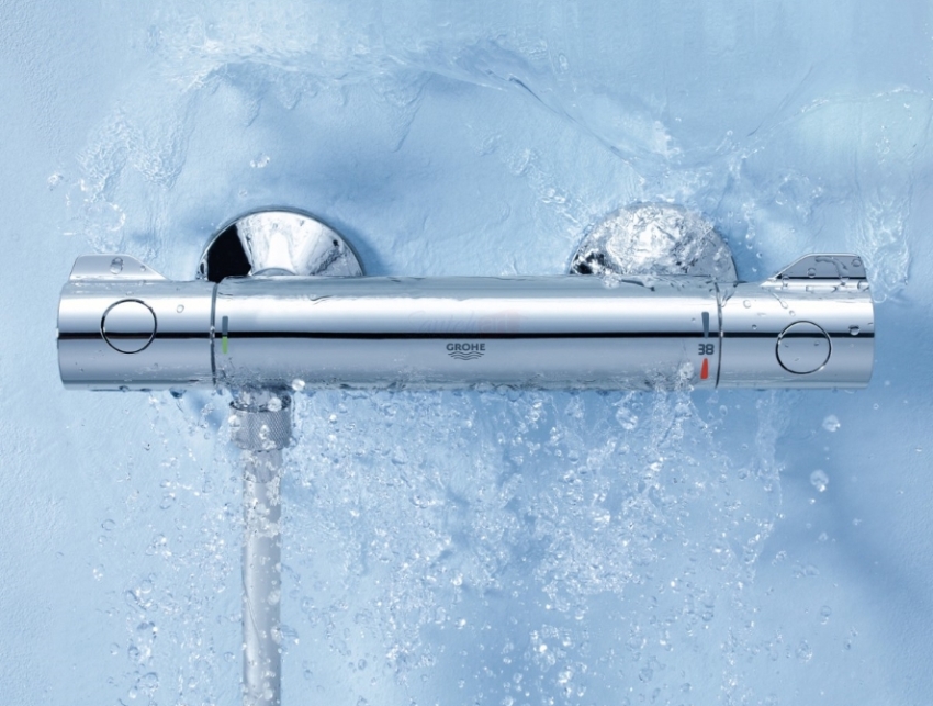Признанным лидером, поставляющим качественные и надёжные термостаты, стала немецкая компания Grohe. Элегантный современный дизайн смесителей сочетается с компактностью и долговечностью. На свою продукцию поставщик предоставляет гарантию в течение 5 лет. Краны надежно защищены от механических повреждений и с помощью новейших технологий позволяют экономить расход воды. Плавная регулировка и быстрое реагирование на изменение параметров среды не позволяет ощутить перепады температур. Цена прибора около 16 тыс. рублей.