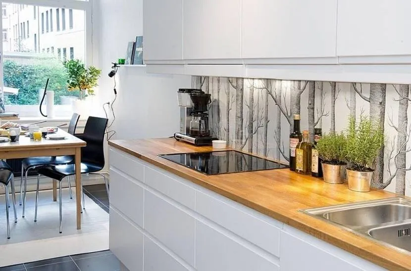 Стеклянный фартук впишется и в уютный светлый скандинавский стиль. Предпочтительней выбирать прозрачную панель, которая не привлечет внимания.