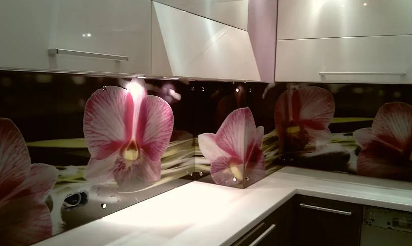 Стеклянные панели, на которые наносится фотоизображение, называются скинали. В настоящее время именно этот вариант стеклянного фартука пользуется наибольшим успехом. Данная конструкция отличается долговечностью и прочностью, к тому же, она очень привлекательно выглядит.