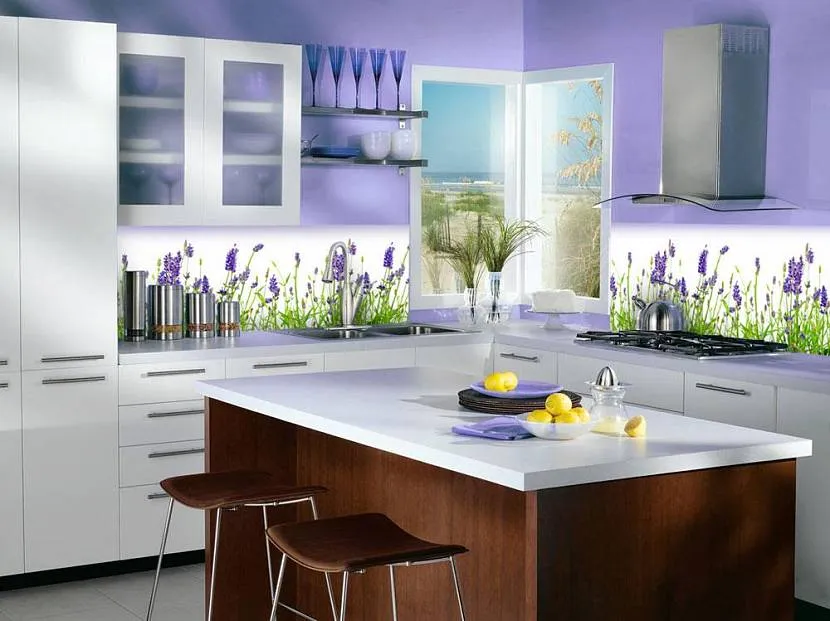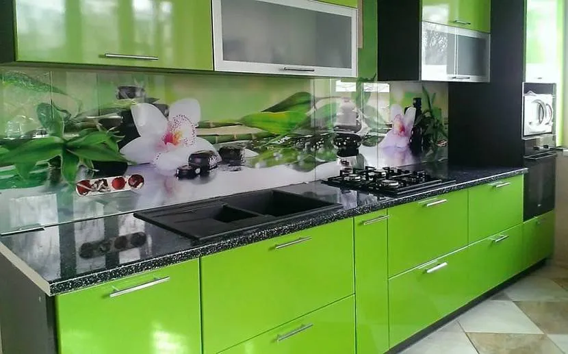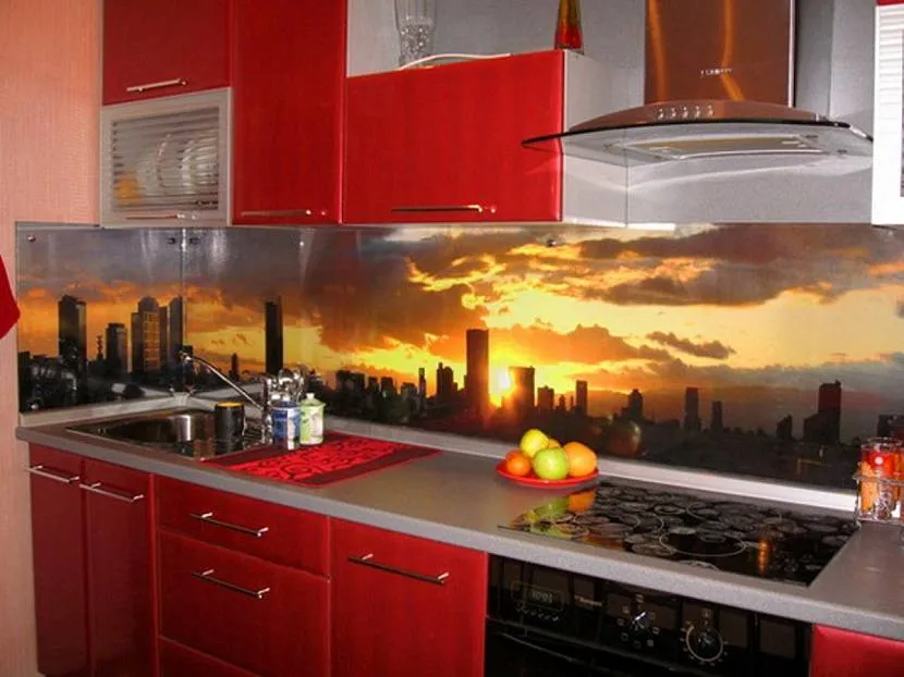 Такой относительно недорогой способ позволяет декорировать кухню изображениями фруктов или ягод, добавив обстановке яркости и сочности. Также популярна тема природы: лес, трава и капли дождя успокаивают и помогают достичь внутренней гармонии. Но, выбирая разноцветное изделие, стоит помнить о главном: кухня не должна смотреться перегруженной. Для этого лучше использовать лаконичный гарнитур и отделку.
