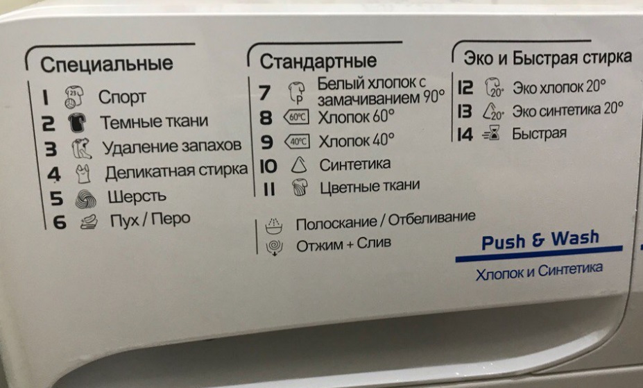 - Push&Wash, отвечающая за параметры процесса. Продолжительность стирки не превышает 50 мин;