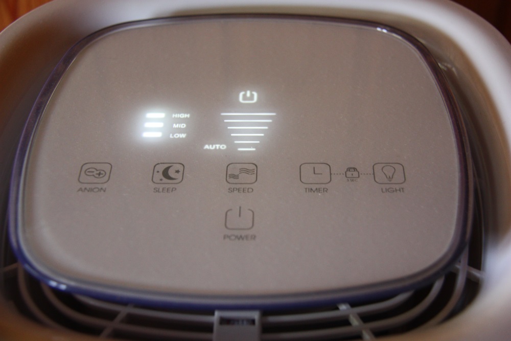 Кнопки сенсорные и снабжены подсветкой, достаточно легкого прикосновения к ним, чтобы включить или выключить мойку, активировать функцию ионизации (кнопка anion), ночной режим (sleep), отключить или включить круговую подсветку панели (лампочка), установить таймер отключения (от 1 до 8 часов с шагом 1 час), выбрать одну из трех скоростей вентилятора (низкая, средняя, высокая – все это по-английски). Нужно заметить, что с увеличением скорости работы вентилятора повышается и уровень шума, что естественно (измерения чуть ниже).