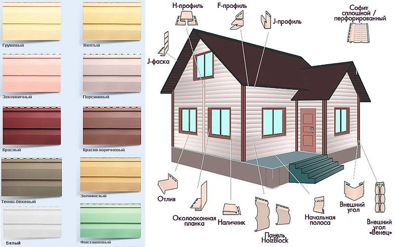 Внешне панель может имитировать корабельную доску, обшивку под «ёлочку» или бревенчатую стену (блок хаус). Помимо самого отделочного материала в продаже представлен полный комплекс доборных элементов, без которых не получится выполнить монтаж. К ним можно отнести стартовый профиль, наружный и внутренний угол, торцевой и соединительный профиль, финишную планку и софиты для подшивки карнизного свеса крыши.