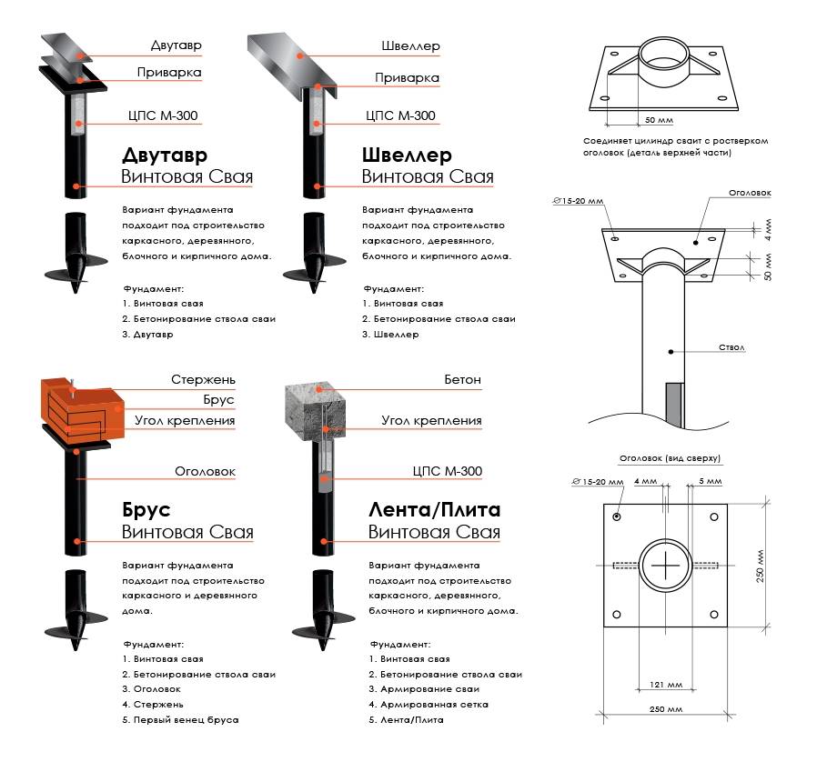 Помимо винтовых конструкций, существует несколько других видов свай. Они различаются материалами изготовления и способами установки. Визуальное различие можно увидеть на схемах и фото.