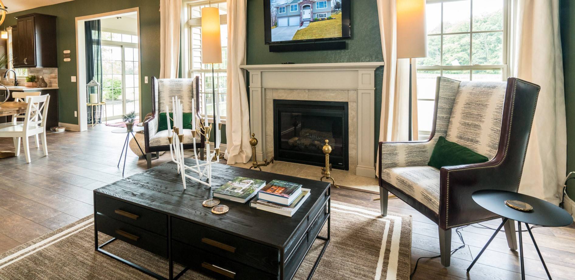 Наиболее часто в проектах загородных домов встречается гостиная с панорамными окнами. Это наименее приватная комната в доме, поэтому даже если кто-то увидит, что там сидят и общаются люди, ничего страшного не случится.