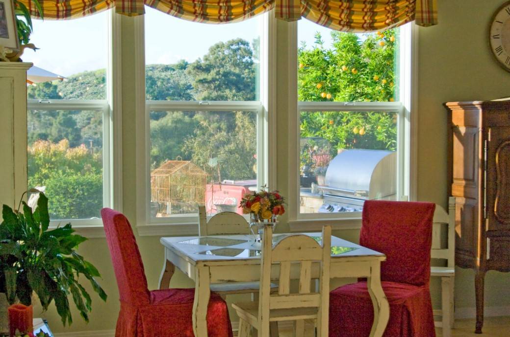 В частном доме при помощи панорамного остекления выделяется обеденная зона на свежем воздухе. Окна позволят отделить эту зону от места для приготовления пищи. Часто французские окна на кухне позволяют сформировать доступ к садовому участку. Это позволяет в кратчайшие сроки принести к столу различные виды зелени и овощи.