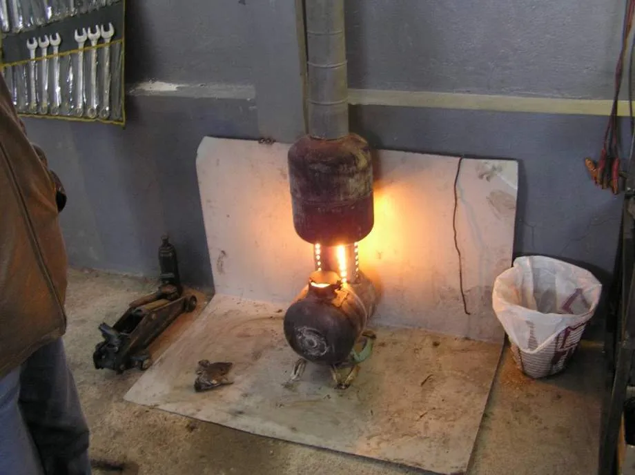 Такая сделанная своими руками буржуйка для гаража любима автовладельцами. Она позволяет свести расходы на топливо к минимуму, ведь для сжигания используется слитое с машины моторное масло. Агрегат имеет необычную конструкцию: два резервуара, расположенные один над другим и соединенные трубой, есть и дымоход. Такое устройство связано с особенностями топлива.