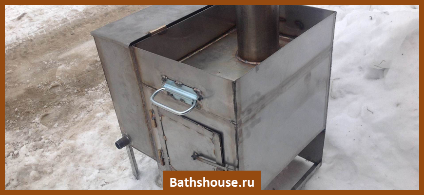 Самая обычная компактная печь имеет элементарную конструкцию и быстро сваривается из листовой стали. Корпус прямоугольный, размеры 55 см х 30 см, высота около метра. Внутри корпуса располагается зольник высотой 15 см, топочная камера высотой 30 см. Над топкой устанавливается открытая сетка для камней. Труба дымохода напрямую от топки поднимается к крыше, проходит сквозь каменку, отдавая ей значительную часть жара.