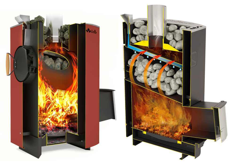 Особенностью изделий данной линии является двухкамерная топка. При этом в нижней из них происходит сгорание топлива, а в верхней за счет вторичного воздуха сжигаются дымовые газы. Из-за этого печи обладают высоким КПД и не требуют большого количества топлива – тепловая энергия почти полностью используется на разогрев каменки.