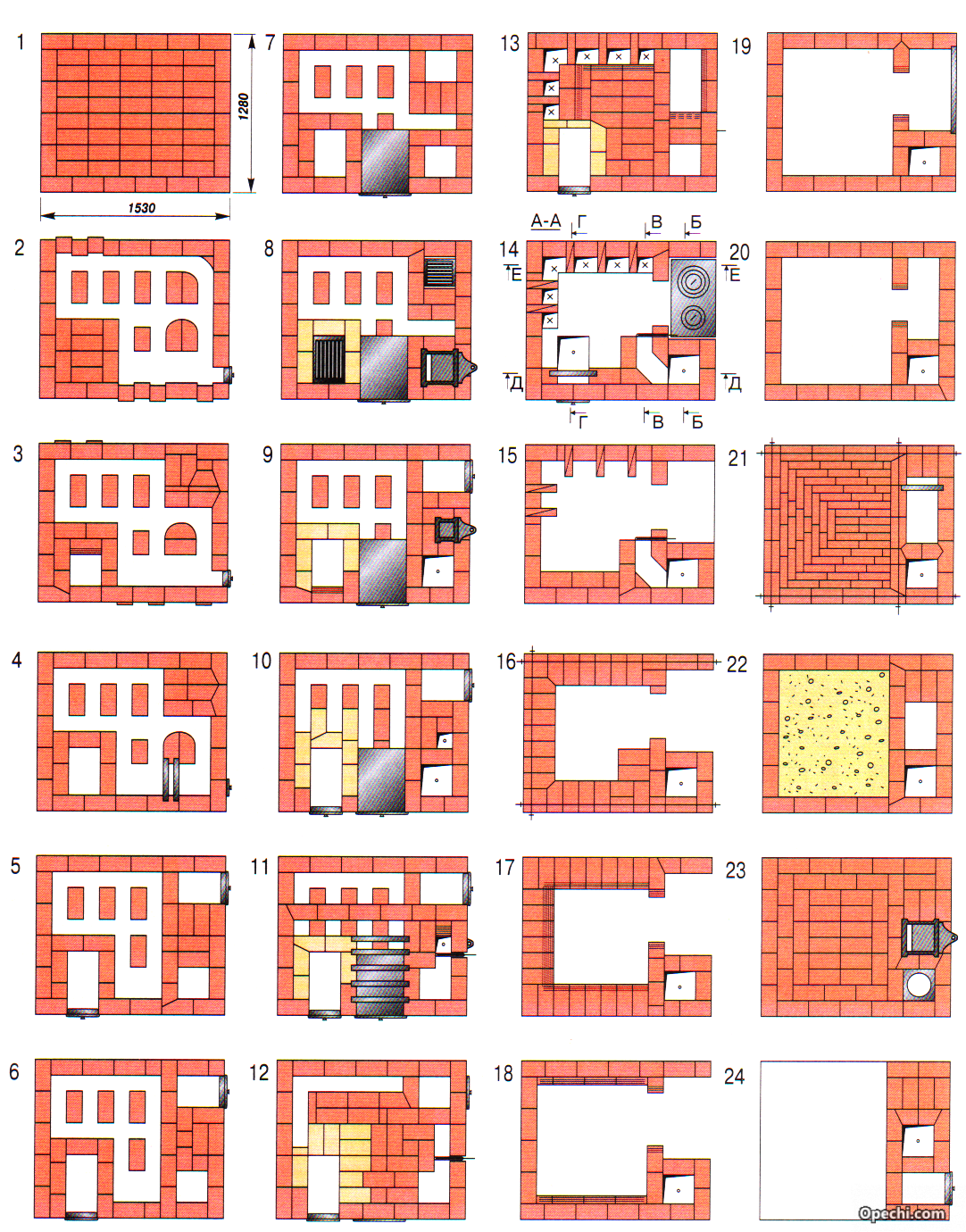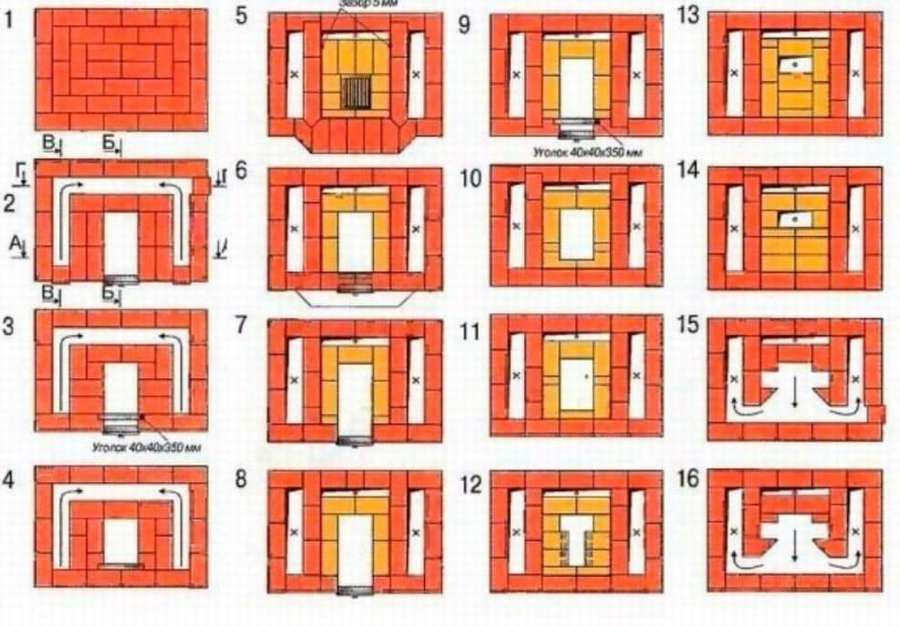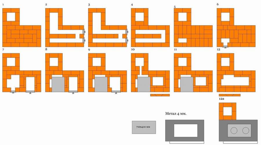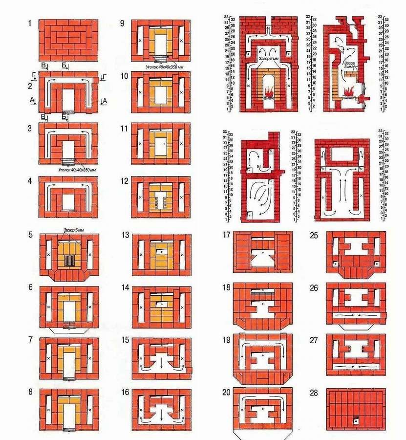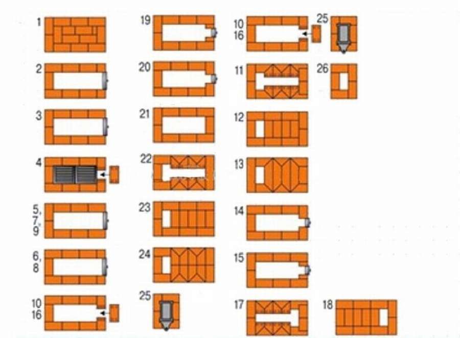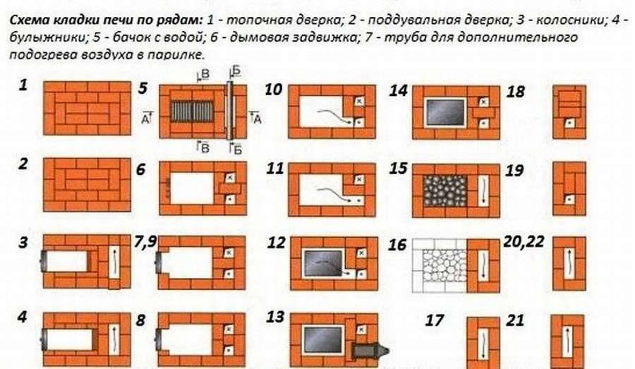 В Интернете в большом количестве можно встретить разнообразные чертежи кирпичных печей для бани с порядовками — подробно расписанными схемами укладки каждого кирпича.