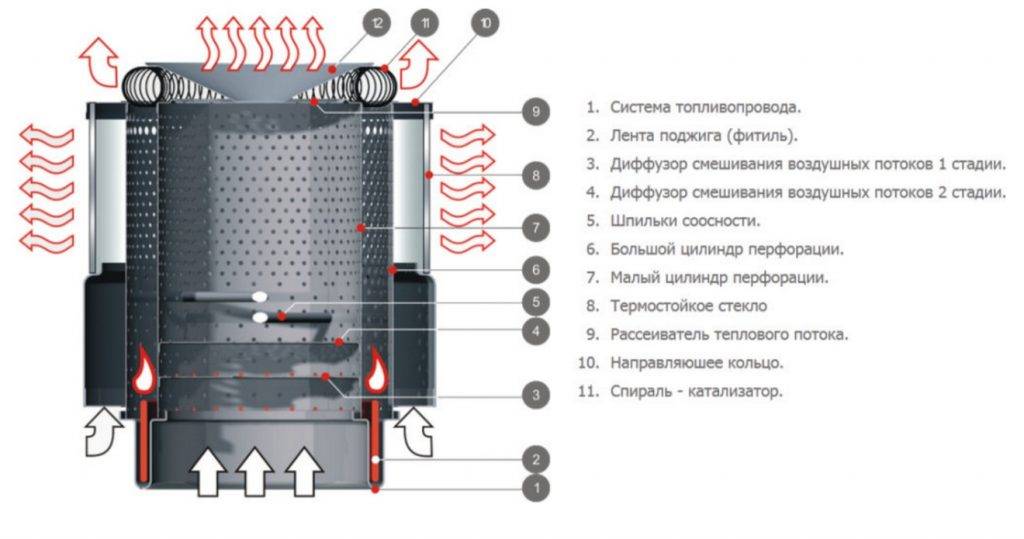 В такого типа печах подразумевается сжигание солярки и керосина. Самотеком или под силой тяжести из топливного бака пополняется фитильная чаша. Разогретое топливо переходит в газообразное состояние, пары наполняют камеру сгорания, где и равномерно горят, накаляя специальную спираль. Регулировка тепловыработки выполняется поворотным вентилем.