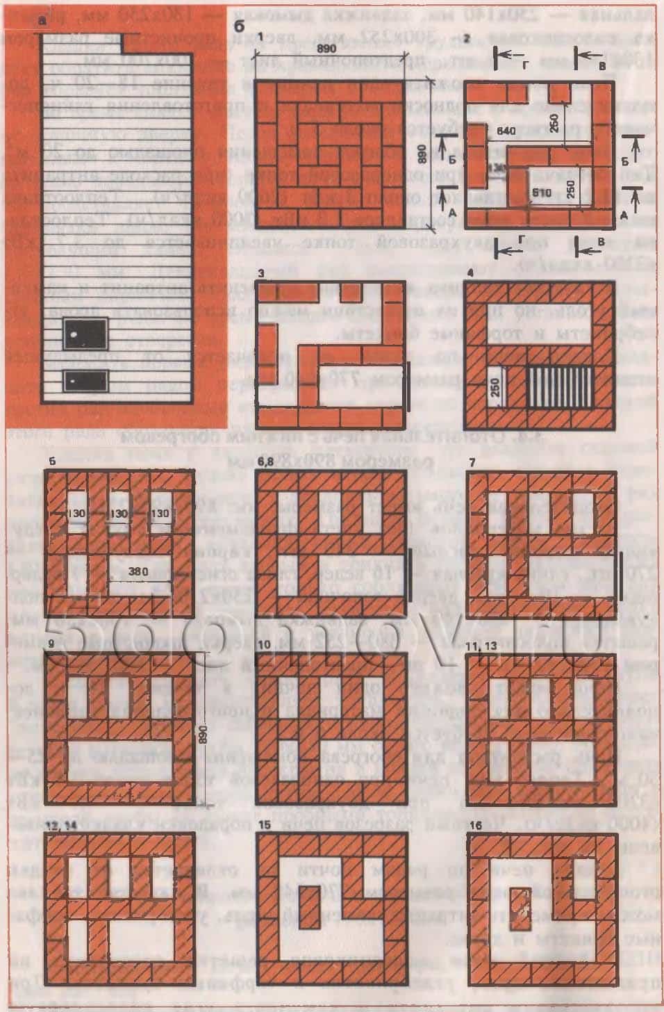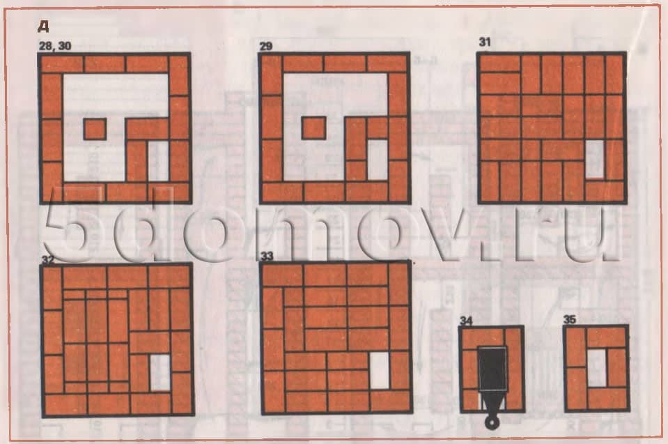 Самостоятельная работа потребует схемы кладки кирпичей в каждом ряду. Такие чертежи называют порядовками. Дым внутри очага проходит сложный путь — нагревая поверхности, он стремится к выходу. Если каналы сложить неправильно, исчезнет тяга и газы, выделяемые при горении, будут поступать в комнату.