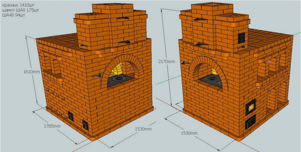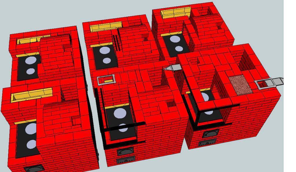 Конструкция печи простая, и при небольших навыках построить ее несложно, однако требуется много фигурной тески кирпича.