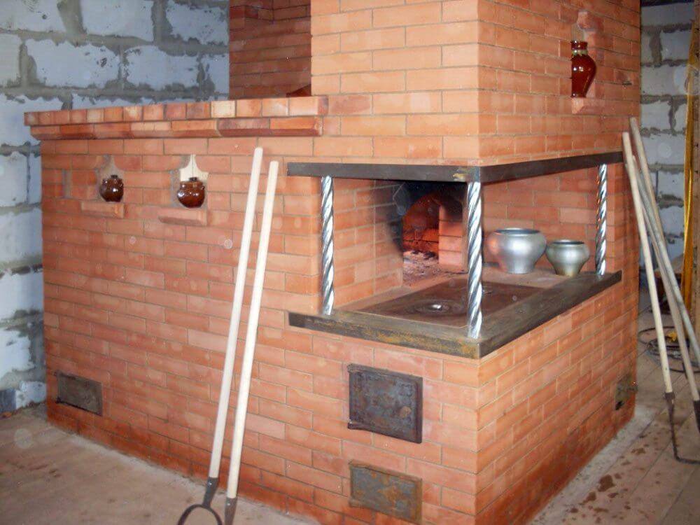 Пространство, в котором находится металлическая духовка, соединено с топкой. Конструкция такова, что между топкой и духовкой есть кирпичная стенка. Однако вверху этой стенки имеется канал для прохождения горячего воздуха. Благодаря такой хитрости духовку нагревает созданный в топке жар, и пламя при этом не имеет контакта с железом. Достаточно открыть дверку духовки, как в помещение хлынет теплый воздух.