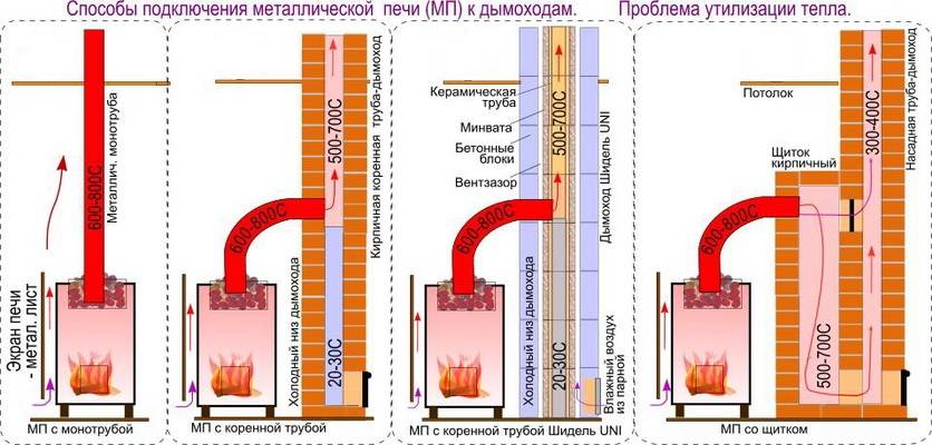 Над баком устанавливается дымоход, который соединяется с отводом от топочной камеры напрямую. Между стенами корпуса и внутренними камерами оставляется воздушный зазор не менее 3—5 см для защиты внешних стен от перегрева.