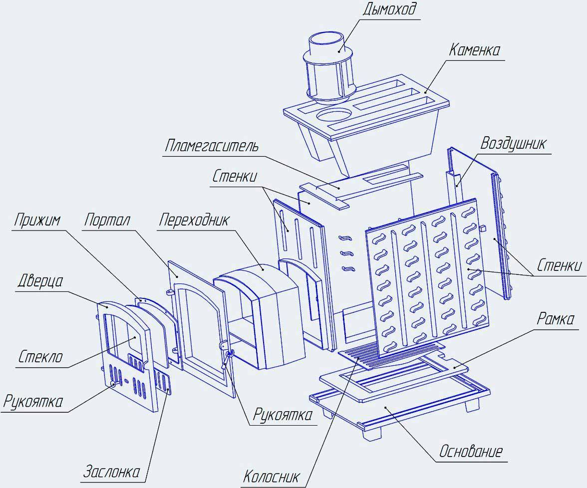 1. так как печи очень тяжелая (ее вес превышает 140 кг) раздельные ее чести удобно транспортировать, заносить в баню и осуществлять монтаж печи.