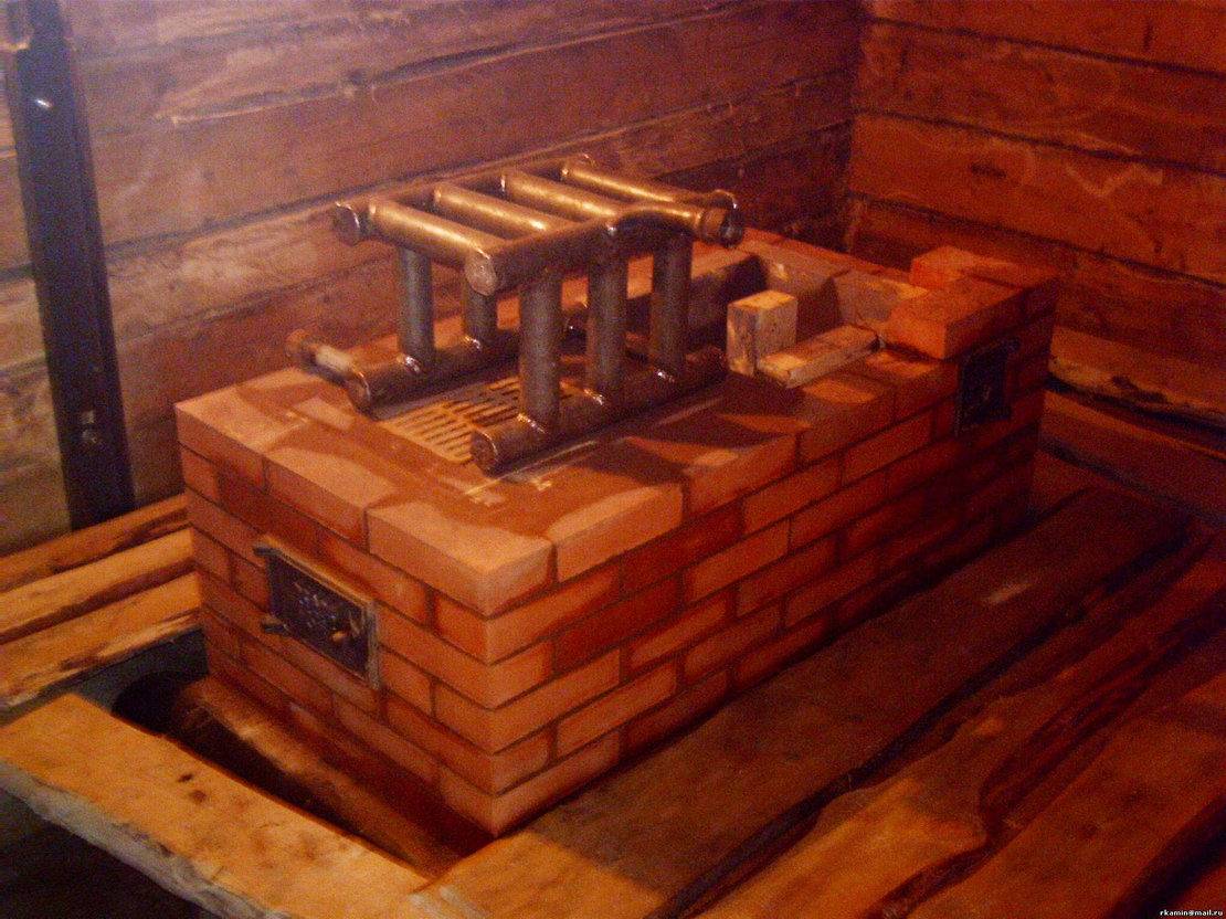 Теплообменник ставится на нижний ряд кирпичей в топке и обкладывается шамотным камнем. Размер конструкции подбирают с учетом параметров топки. Должно остаться достаточно места для закладки дров. Регистры не должны прикасаться к стенам топочной камеры, но и слишком большое расстояние не пойдет на пользу. В топке оставляют отверстие для входного патрубка и затем выкладывают свод.
