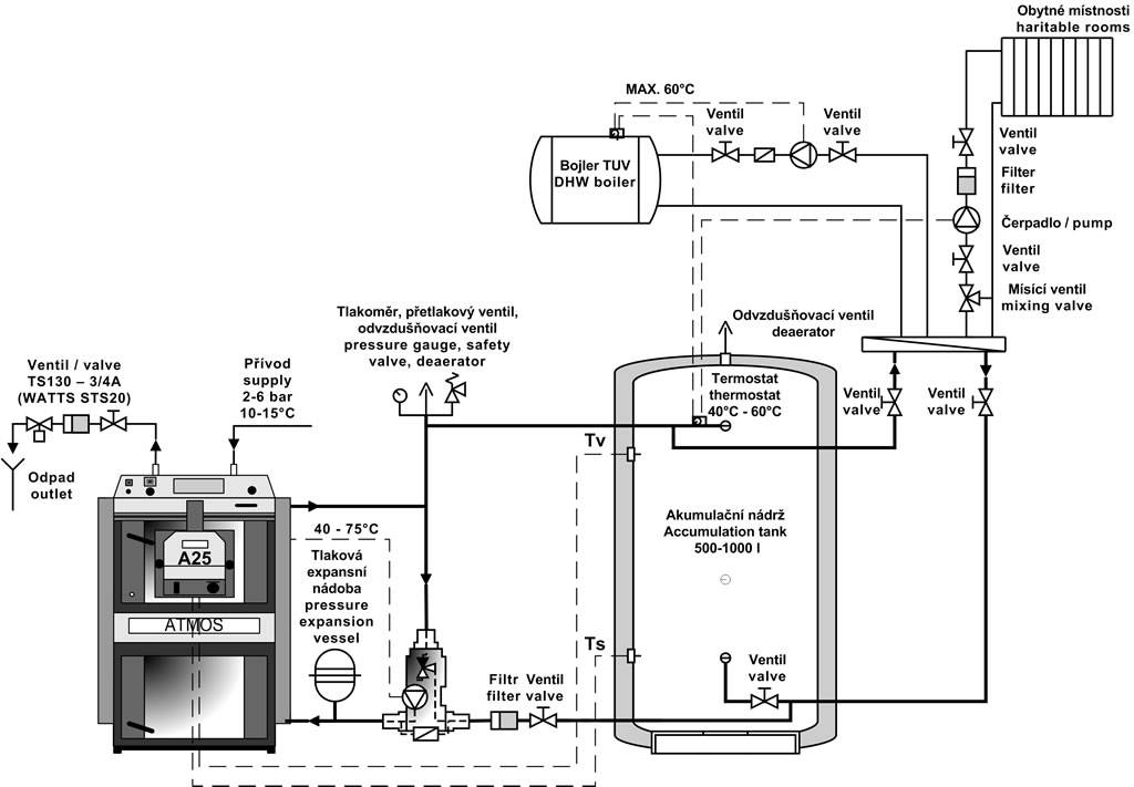 А для внештатных ситуаций, вызванных авариями в линиях электропередач или отказом контроллера котла, стоит предусмотреть схему аварийного отключения подачи топлива и воздуха в камеру сгорания котла. То , которое на момент аварии будет находиться в топке котла, уже неспособно вызвать перегрев теплоносителя в системе отопления.