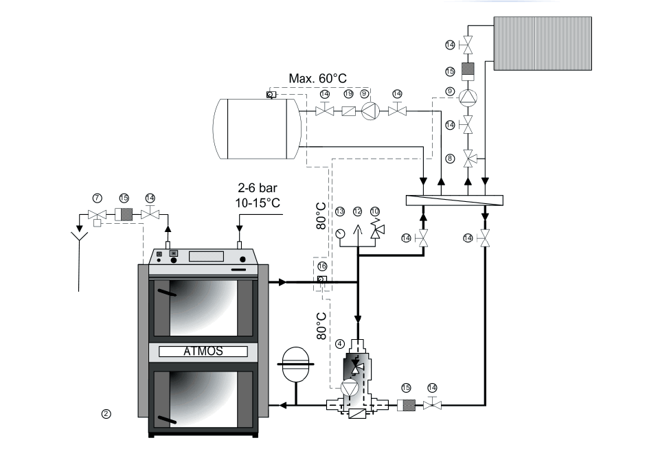 Нижний патрубок котла врезается в обратку, верхний патрубок врезается в подачу. Горение пеллет в горелке котла строго контролируется при помощи двух факторов: