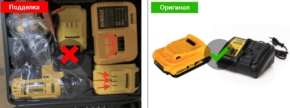 Для зарядки оригинального шуруповерта используется устройство с определенным внешним видом. Сравнение с подделкой представлено в таблице.