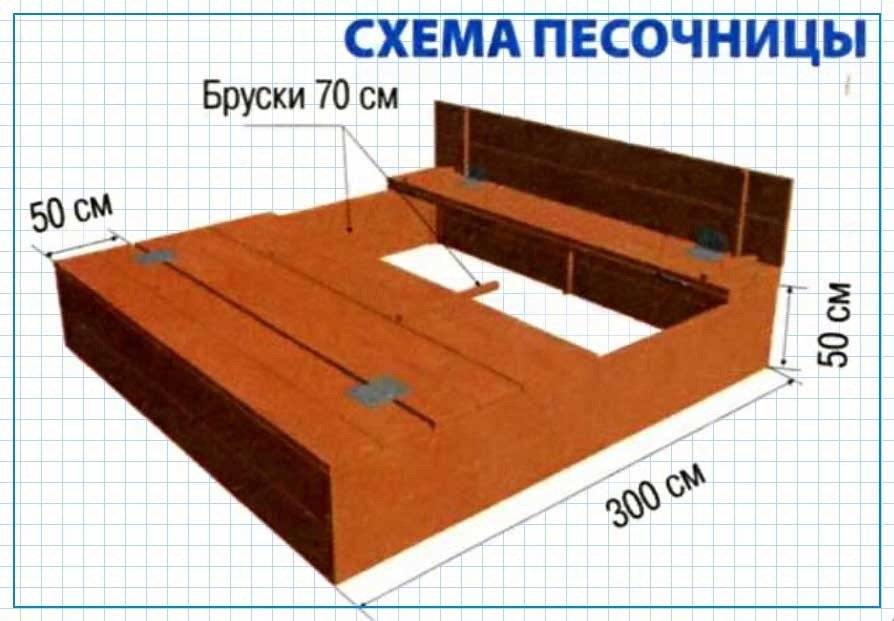 Важно учитывать, что высота бортика песочницы будет меньше ширины доски, так как конструкция несколько заглубляется в землю. В чертеже конструкции необходимо отметить толщину песочного слоя, (не менее 15-20 сантиметров)