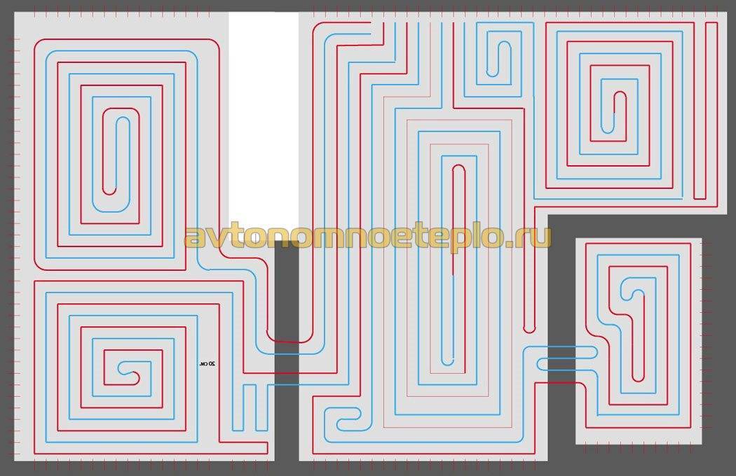 в настоящее время имеется большое количество компьютерных программ, позволяющих спроектировать любой вариант петли для всего контура. Для большого по площади помещения лучше всего предусмотреть несколько контуров, чтобы прогрев воздуха от пола был максимальным и равномерным по всей площади. В данном случае чаще всего применяется схема «улитка». Здесь чередуются друг с другом противоположные потоки системы (холодные и горячие).