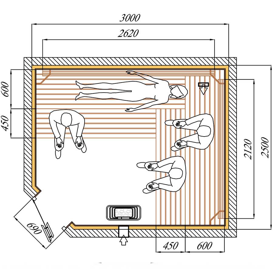 Пространство 3 на 4 не обладает хорошей вместимостью, поэтому обычно в плане присутствует парилка с мойкой и предбанником