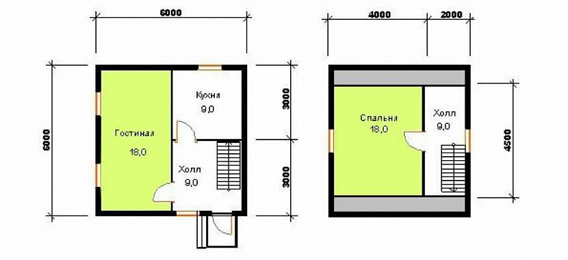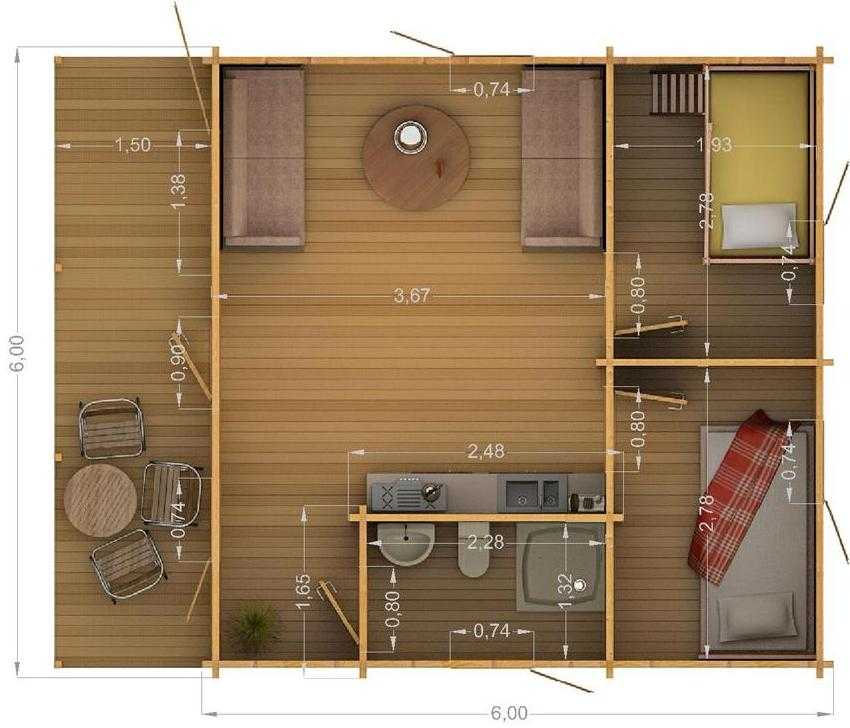 Одноэтажный дом площадью 6х6 имеет не так много вариантов планировки, как двухэтажные дома. Ведь на одной площади необходимо расположить все необходимые помещения и разделить их тонкими перегородками.