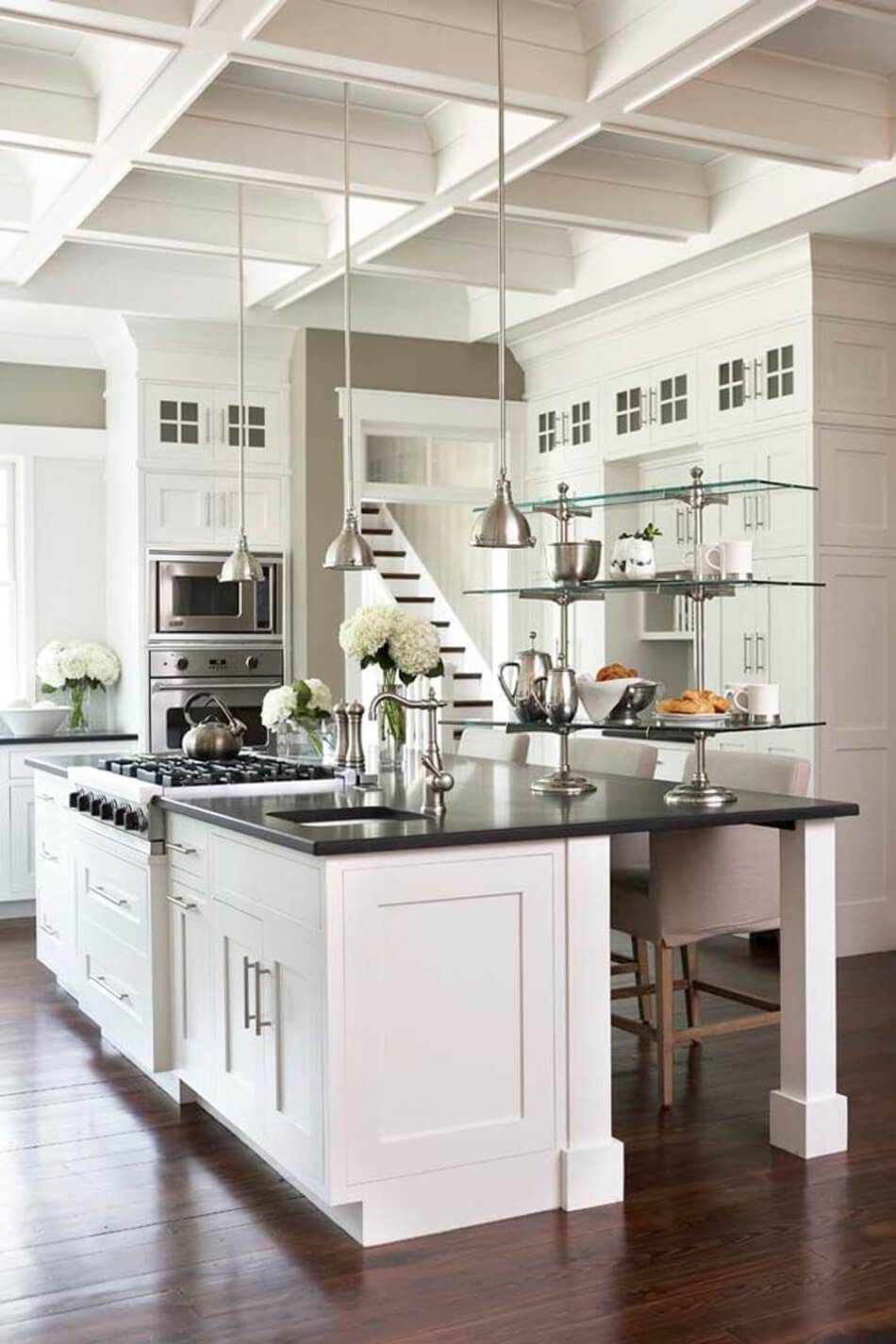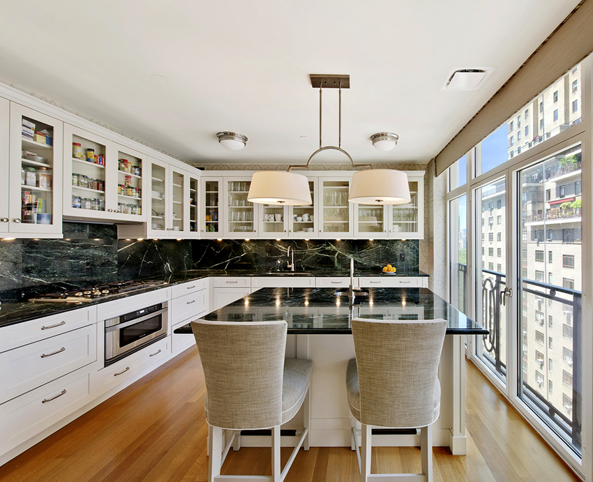 Белые фасады и темные столешницы в классическом стиле – это модно и привлекательно.