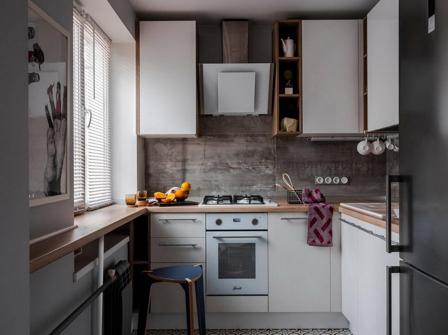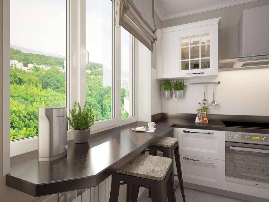 Это сравнительно новый, но уже ставший популярным среди владельцев маленькой кухни прием. Площадь подоконника расширяется и становится продолжением столешницы. Она может выполнять функции рабочей зоны или стать обеденным местом для небольшой семьи из двух человек. Превратите подоконник в барную стойку, так вы сможете отказаться от обеденного стола.