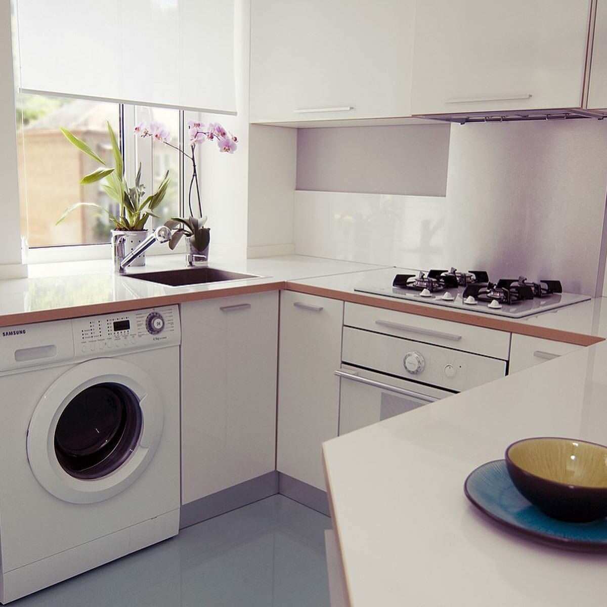 Распланировать кухню таким образом можно даже при небольшой площади: 7 метров уже достаточно. Может, шкафов буде немного, но поместиться должно все. Часто при Г-образной кухне мойку делают в углу, под ней — отсек для хранения мусорного ведра, моющих средств и технических приспособлений.