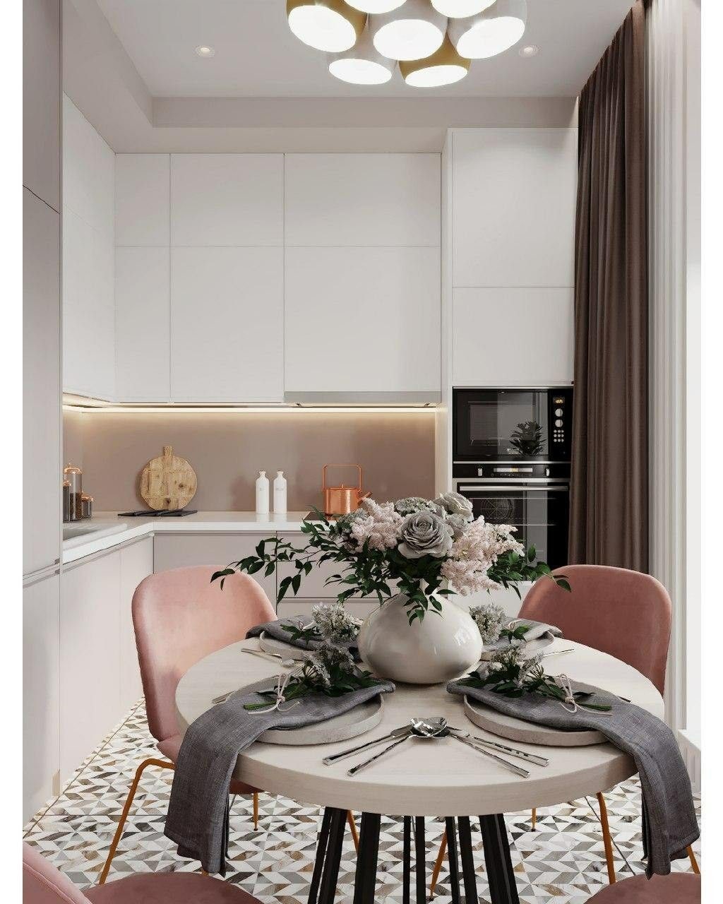 Для небольшой семьи можно организовать обеденную зону за счет разноуровневых столешниц, как на фото выше. Если помещение квадратное или широкое, обеденный стол можно поставить посередине.