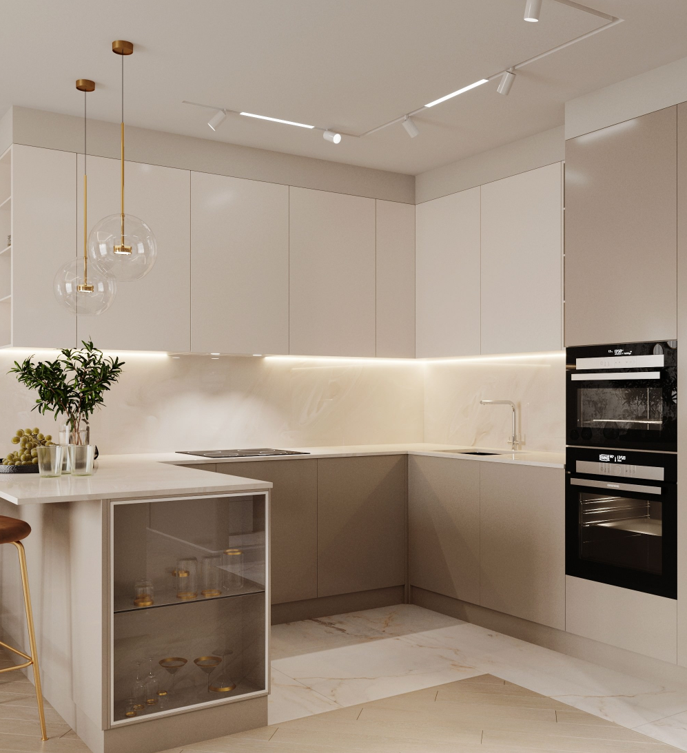 Стильно смотрится молочный или черно-белый интерьер в такой кухне. К основному светлому тону можно добавить несколько ярких акцентов. Как пример, красочные жалюзи или декорированная столешница.