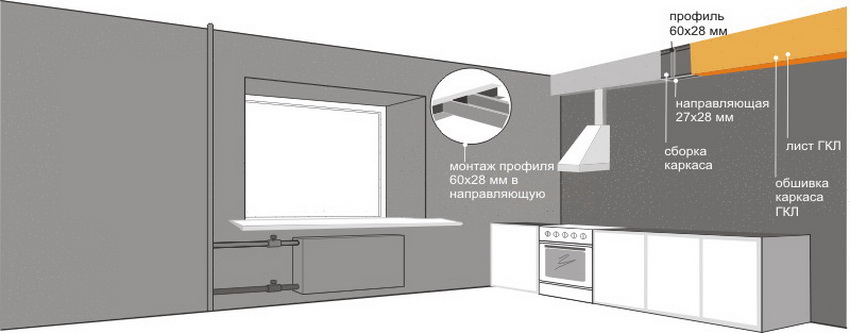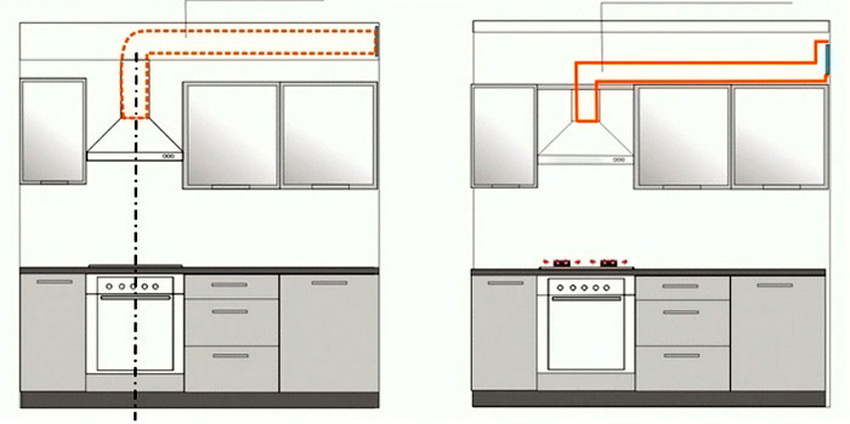 Схемы расположения воздуховода: за навесным потолком и над кухонными шкафчиками