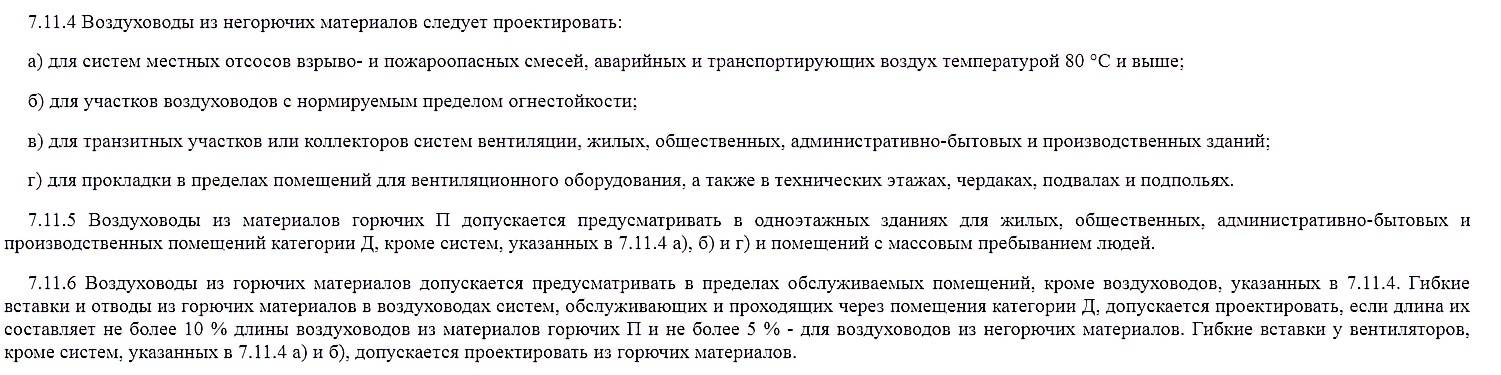 Согласно СНиП 41-01-2003 пункт 7.11 пластиковые воздуховоды можно использовать в малоэтажных жилых, общественных, административно-бытовых и производственных зданиях категории Д. Их нельзя укладывать в подвалах, подпольях, на чердаках и технических этажах, в помещениях с нормируемыми условиями противопожарной безопасности.