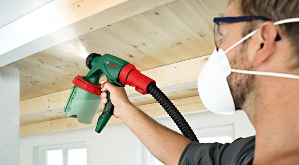 Правила нанесения такие же, как для валика, но важно учесть, что процесс продлится дольше. В настоящее время для побелки все чаще применяют распылитель. Работать с ним максимально просто: достаточно нанести три слоя краски, при этом за направлением полос можно не следить, главное – не пропускать участки