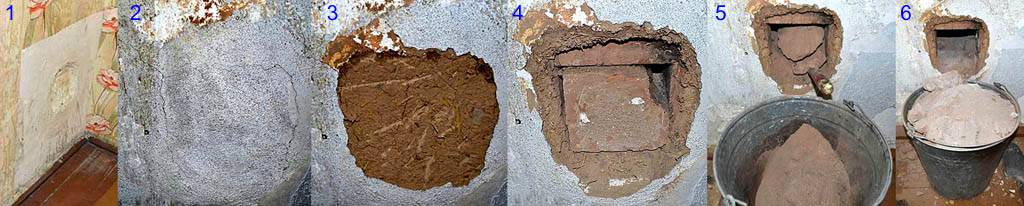 «Проявиться» прочистной кирпич может впадиной на обоях (поз. 1 на рис.), их выпуклостью или изменением цвета. На побелке под штукатурке появляется оконтуривающая кирпич трещина (поз. 2), по которой и может подсасываться в печь воздух. Дальше – грязно и тяжеловато, но просто, поз. 3-6.