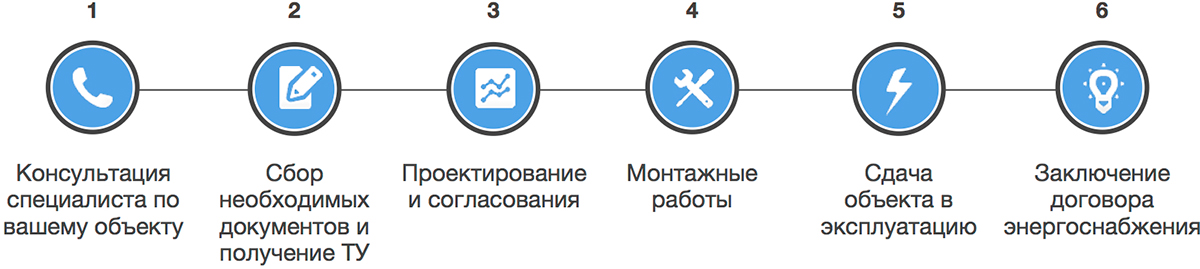 После проверки всех документов и получения разрешения на подключение к электросетям происходит заключение договора на техприсоединение. В договоре четко оговорены сроки, в которые осуществляются монтажные работы и подключение оборудования. Как правило, энергосбыт указывает срок до 6 месяцев. Чаще всего срок зависит от расстояния, на которое потребуется протянуть провода.