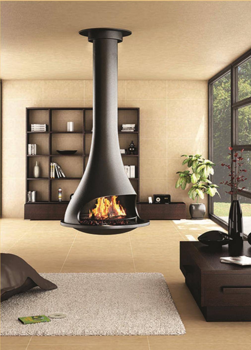 Висячий камин, который работает от дымохода, чаще всего напоминает по форме цилиндр, так как очень важно обозначить правильное присоединение к дымоходу. Популярны также модели по виду напоминающие конусообразный шатер. Топка представленных моделей бывает как открытой, так и закрытой
