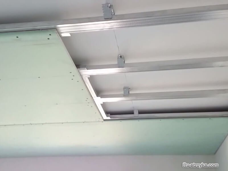 На основном потолке установлены П-образные подвесы, а по периметру – профиль UD