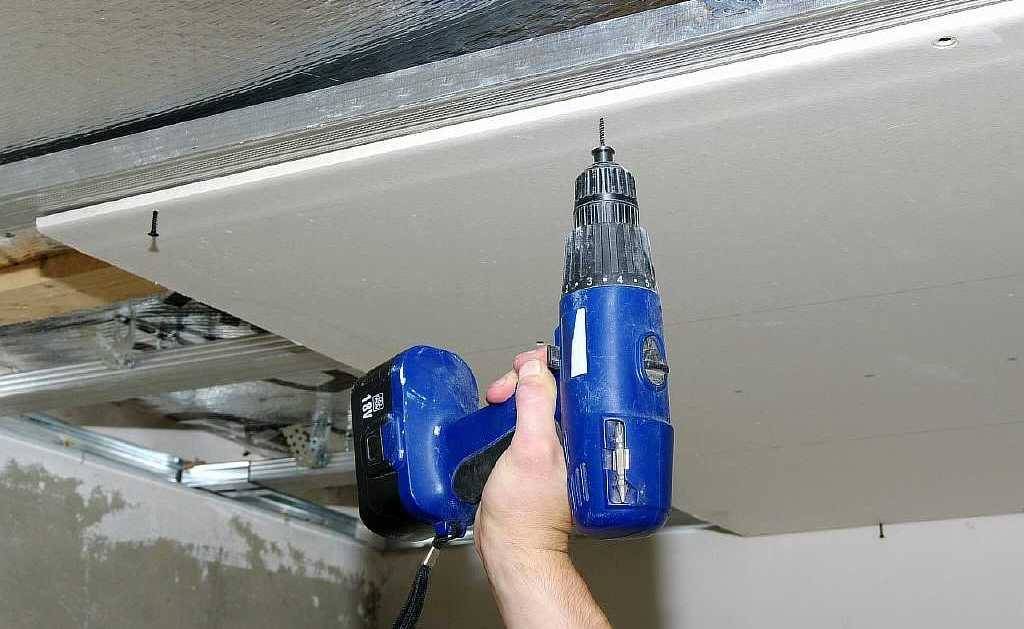 По окончании установки каркаса и профиля производится обшивка конструкции будущего подвесного потолка влагостойким гипсокартоном. Гипсокартон крепится на саморезы, для выполнения такой работы очень удобно пользоваться шуруповертом.