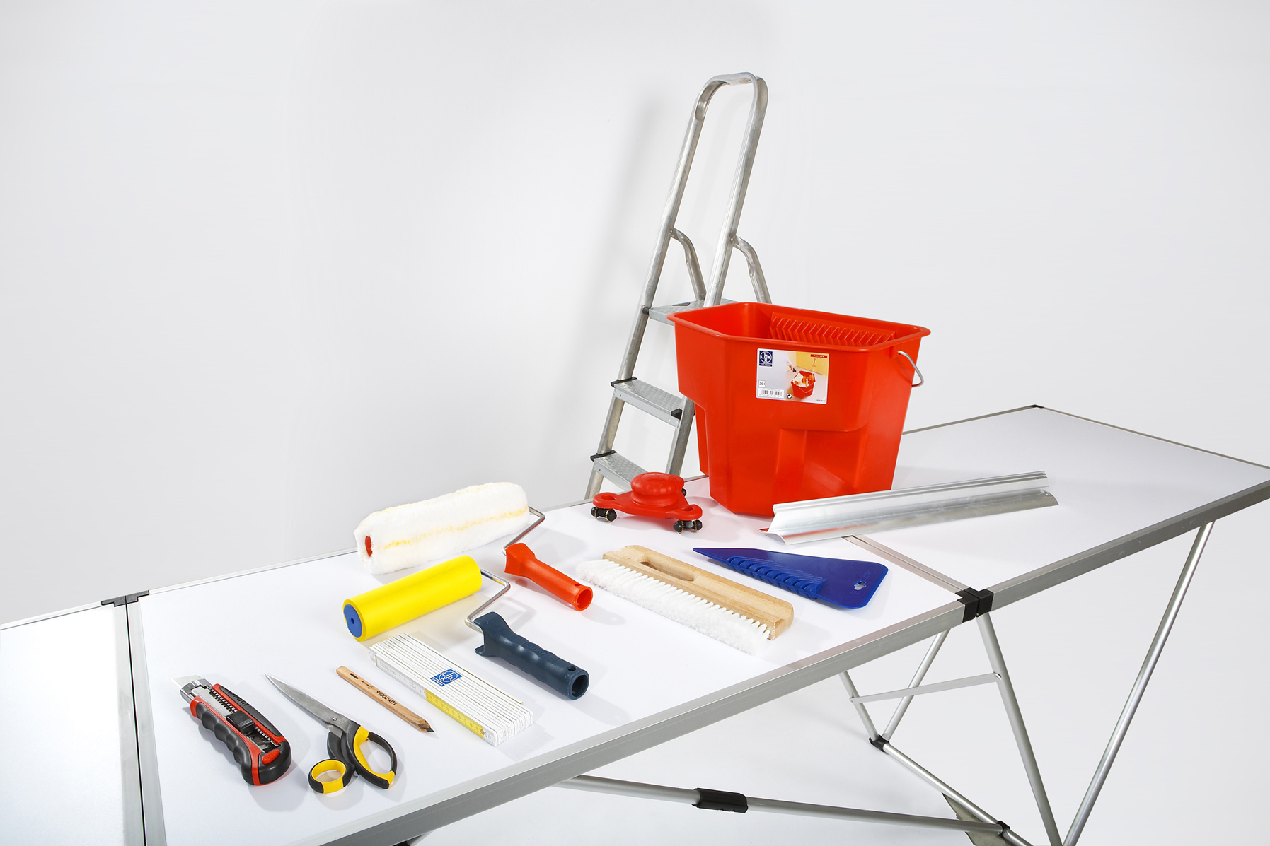 При работе на потолке потребуется прочный стол – на нем удобнее размещать все инструменты и материалы. Также пригодятся ножницы или нож, отвертка или шуруповерт, средства индивидуальной защиты.
